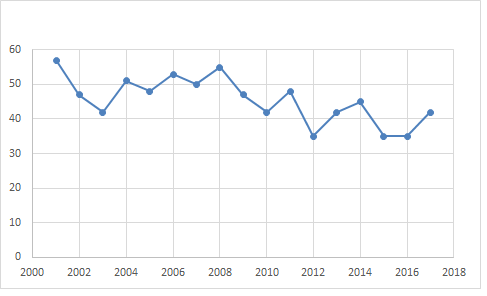 De grafiek bevatten het aantal personen dat is overleden als gevolg van een dodelijke arbeidsongeval.