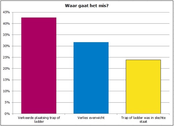 Een ongeval heeft vaak meerdere achterliggende oorzaken. Er gaan meer dingen mis. Bij een val van een ladder of trapje is er bij 43% van alle gevallen iets mis gegaan met de plaatsing van de ladder of het trapje. Zo wordt de ladder bijvoorbeeld onder een verkeerde hoek tegen de muur gezet. Bij ongeveer 32% van de ongevallen ging er iets mis met de lichaamsbalans of het bewustzijn van de medewerker. Hij verliest bijvoorbeeld zijn evenwicht of voelt zich niet goed en valt als gevolg van de ladder. Bij 24% van de ongevallen was de trap of ladder zelf in een slechte staat.