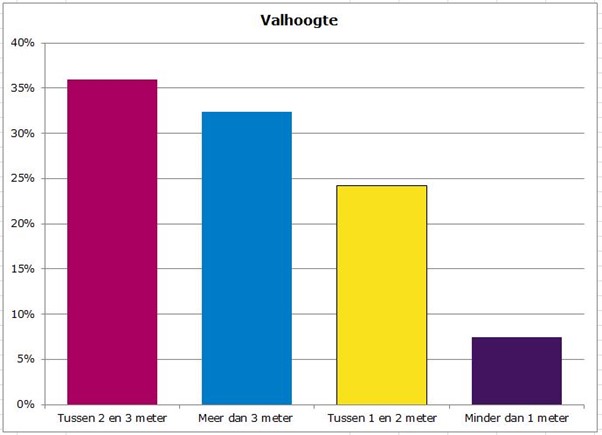 Bij het merendeel van de ongevallen is er sprake van een valhoogte van hoger dan 2 meter, waar er in 32% van de gevallen zelfs sprake is van een valhoogte van meer dan 3 meter. Slechts bij 7% van de ongevallen is de valhoogte minder dan 1 meter.