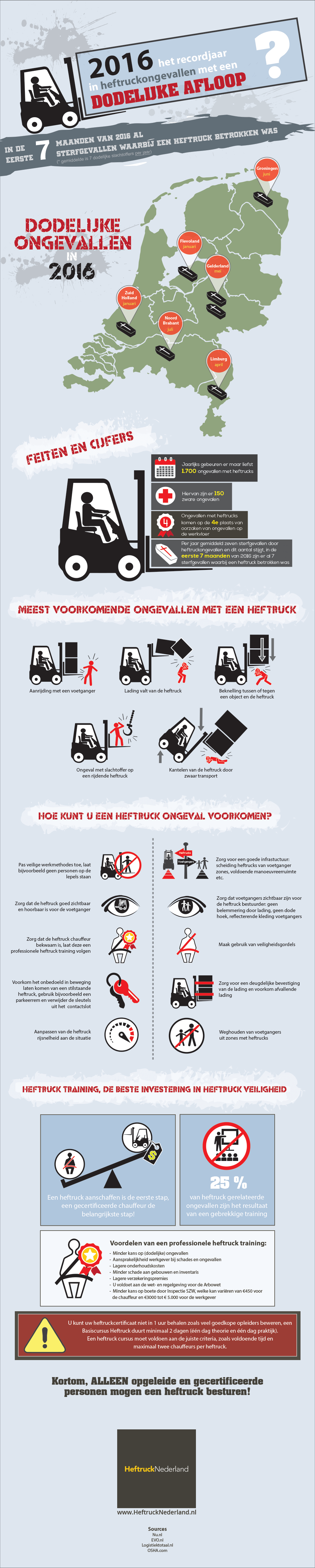 In 2016 vielen er in de eerste 7 maanden van het jaar in Nederland al 7 dodelijke slachtoffers bij een heftruckongeval. Heftruck Nederland toont tips voor veilig werken met een heftruck in een infographic: