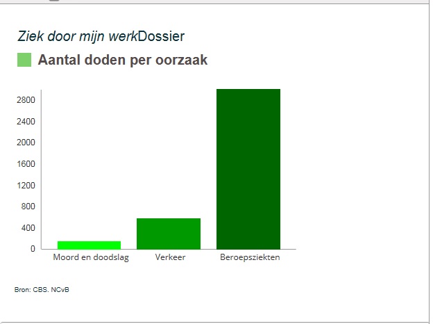 Wat zeggen deze cijfers? In ieder geval dat er vele malen meer mensen overlijden door een beroepsziekte dan in het verkeer of door een misdaad. Maar wordt er voldoende aan gedaan om de 8 doden per dag door beroepsziekten terug te dringen? Met die vraag gingen we naar Jan Popma, onderzoeker arbeidsomstandigheden van de Universiteit van Amsterdam.