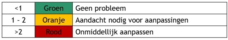 Deze kleuren worden vaak gekoppeld aan de ‘Lift index’ van de NIOSH methode waarbij een waarde van minder dan 1 als veilig wordt beschouwd, terwijl hogere waarden wijzen op een verhoogd risico.