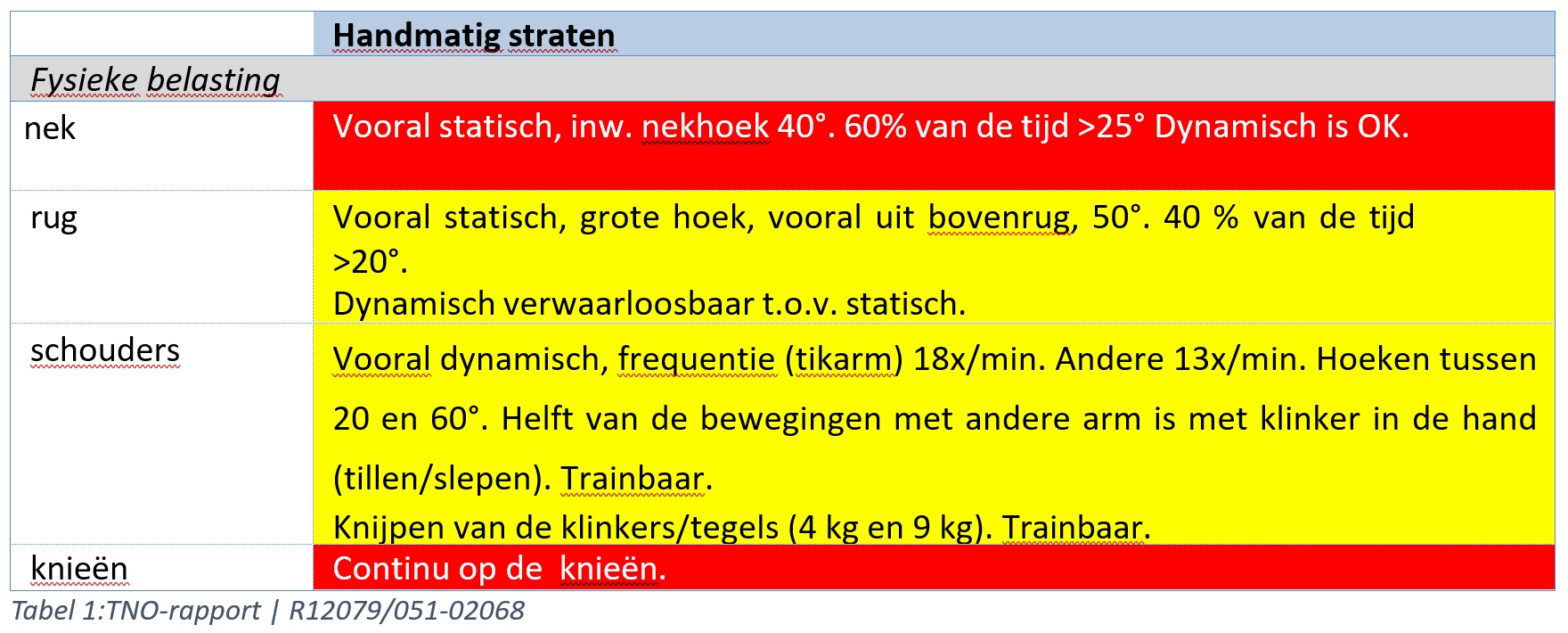 In 2012 is er door TNO een onderzoek ‘Fysieke belasting van handmatig en mechanisch straatmaken’ gepresenteerd. Bij dit onderzoek is o.a. ook onderzocht wat de fysieke belasting is bij het handmatig aanbrengen van elementen. Een overzicht hiervan is te vinden in Tabel 1.