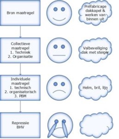 De Arbowet geeft aan dat bronmaatregelen altijd voor gaan. Alleen als bronmaatregelen om technische redenen niet mogelijk zijn, kiezen voor collectieve maatregelen. Maar als de kosten van een bronmaatregel onevenredig hoog zijn, zijn collectieve maatregelen wel mogelijk. Dat principe geldt ook voor de stap van collectieve maatregelen naar persoonlijke maatregelen.